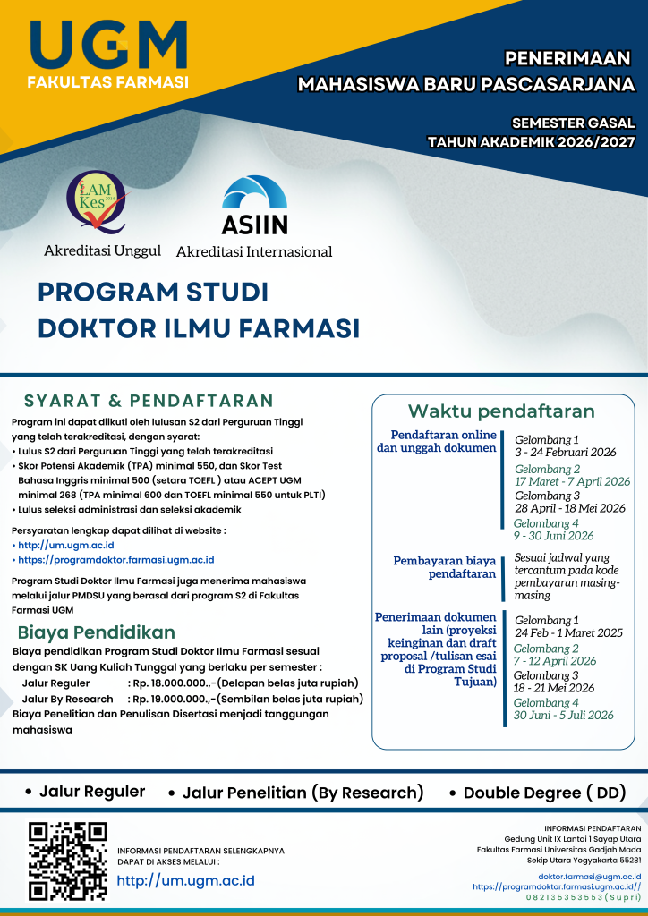 Persyaratan Administrasi Mahasiswa Baru Program Reguler dan Program By Research Program Studi Doktor Ilmu Farmasi Fakultas Farmasi UGM: