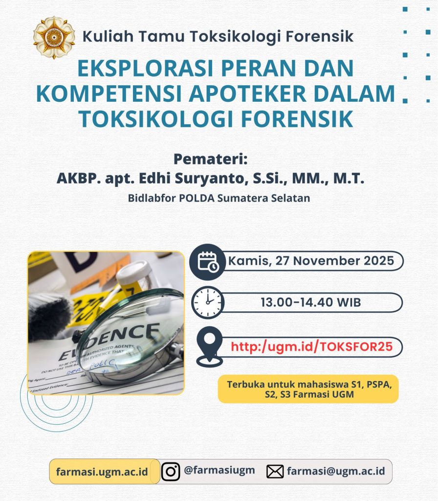 Jangan lewatkan kesempatan emas untuk belajar langsung dari praktisi! Fakultas Farmasi UGM menghadirkan kuliah tamu spesial bersama AKBP. apt. Edhi Suryanto, S.Si., MM., M.T. dari Bidlabfor POLDA Sumatera Selatan.